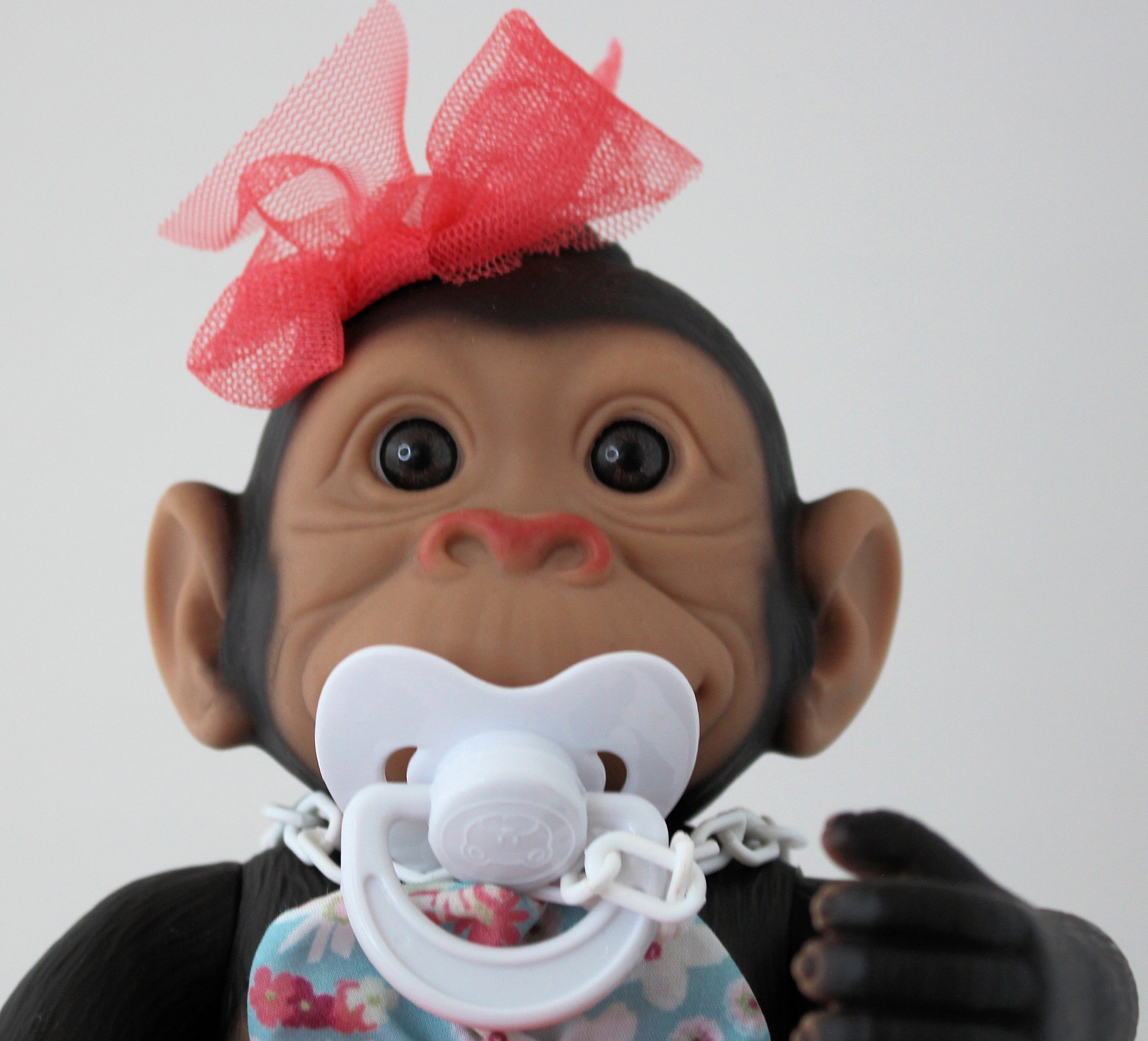 This baby monkey is one of a set of 8 baby monkeys, each sold individually. She is fully jointed and comes with a pacifier, and is wearing a blue floral outfit with a pink bow in her head. Her left hand is cupped so that she can hang from a tree. Made from all vinyl and 10 inches tall, perfect for ages 3 and up.