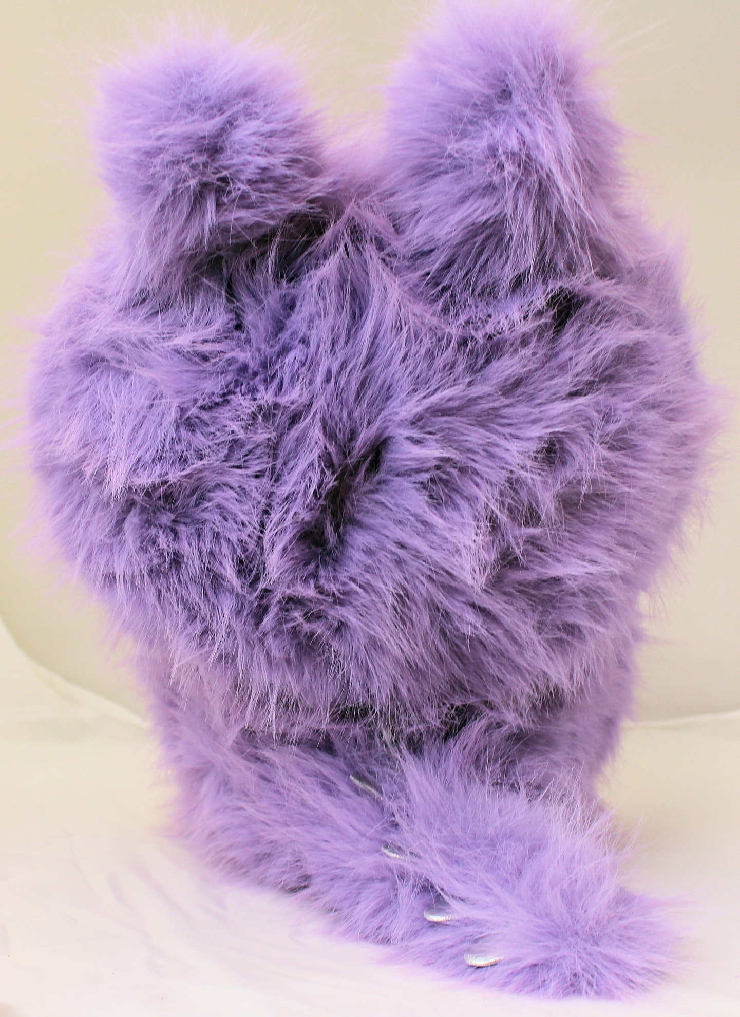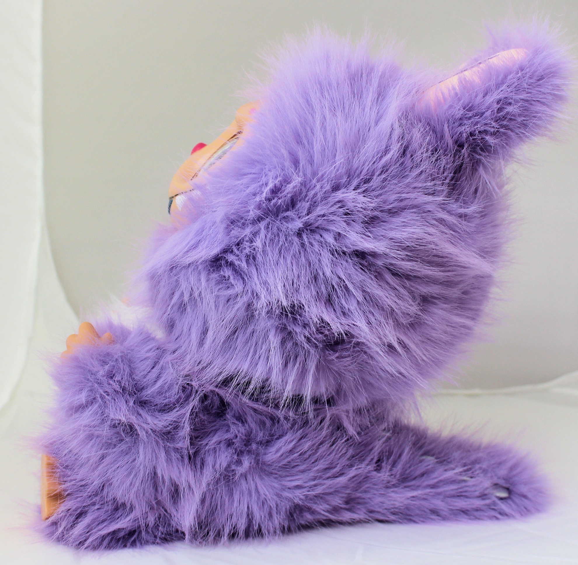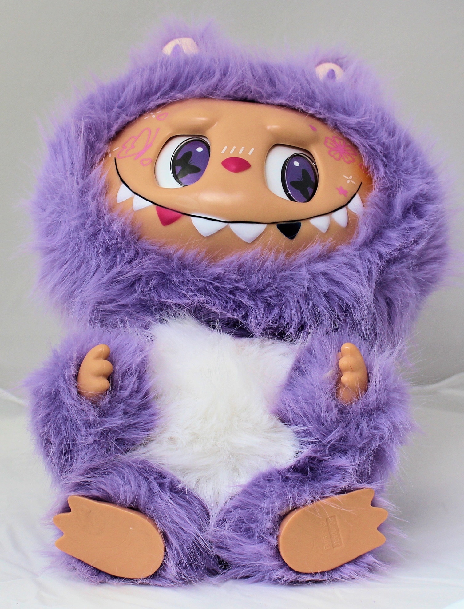 Inspired by "The Monsters" series from Labubu, this Zimono replica oozes charm. With purple soft plush fur, vinyl face, hands and feet, this soft and cuddly plush is sure to brighten your day! This sweet one has purple eyes with butterfly shaped pupils, 9 teeth, all white, except one pink and one blue! It has shiny silver scales along its tail. It is 15 inches tall (38 cm) and weighs about 4 pounds. Please understand this is a replica of the popular brand Labubu.