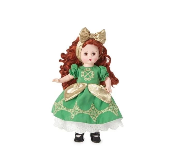 This red-headed beauty brings the luck of the Irish. This 8-inch collectible doll is dressed in a green dress embroidered with gold Celtic symbols and gold apron. Her flowing, curly red hair is topped with a gold bow. She has light skin and brown eyes. The Lucky Irish Lass doll is a classic Wendy doll with an articulated body. Recommended for ages 14+.