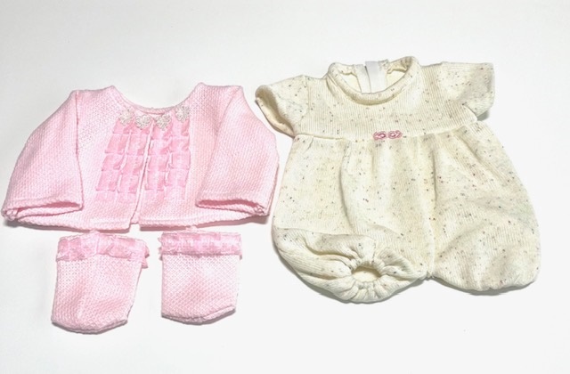 This short sleeved onesie is made of an off-white knitted material. A pink knit sweater with ribbon trim down the front is worn over the onesie. Matching booties complete the outfit.