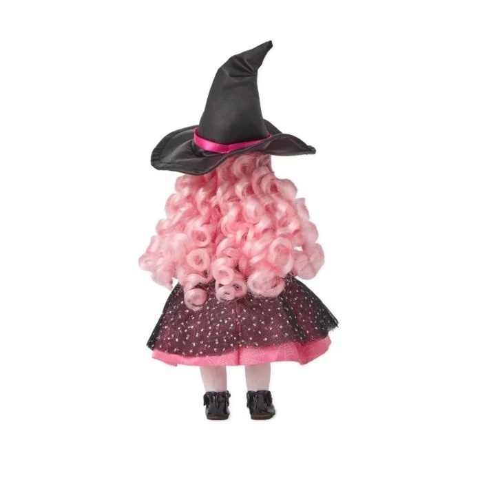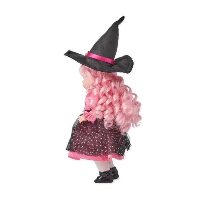 This Pink Whimsical Witch comes complete with pink cascading curls topped with a black satin witches hat. Her cobweb printed pink satin dress has black tulle polka-dotted panels and black bows down the front of her skirt. She is in stock and available for next day shipping.