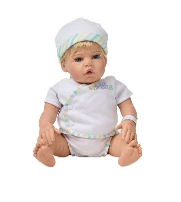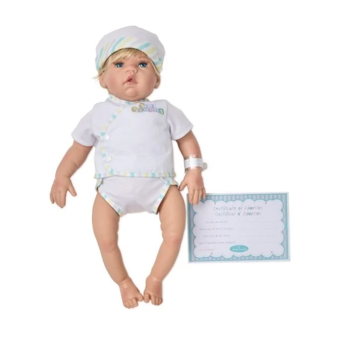 Meet Wee Wonder, the 18-inch newborn baby doll that looks and feels just like a real baby! They come dressed in cute wrap tops, cloth diapers, and a matching hat. Plus, each doll comes with a hospital bracelet and birth certificate. This Wee Wonder baby doll features blue eyes and blonde hair.